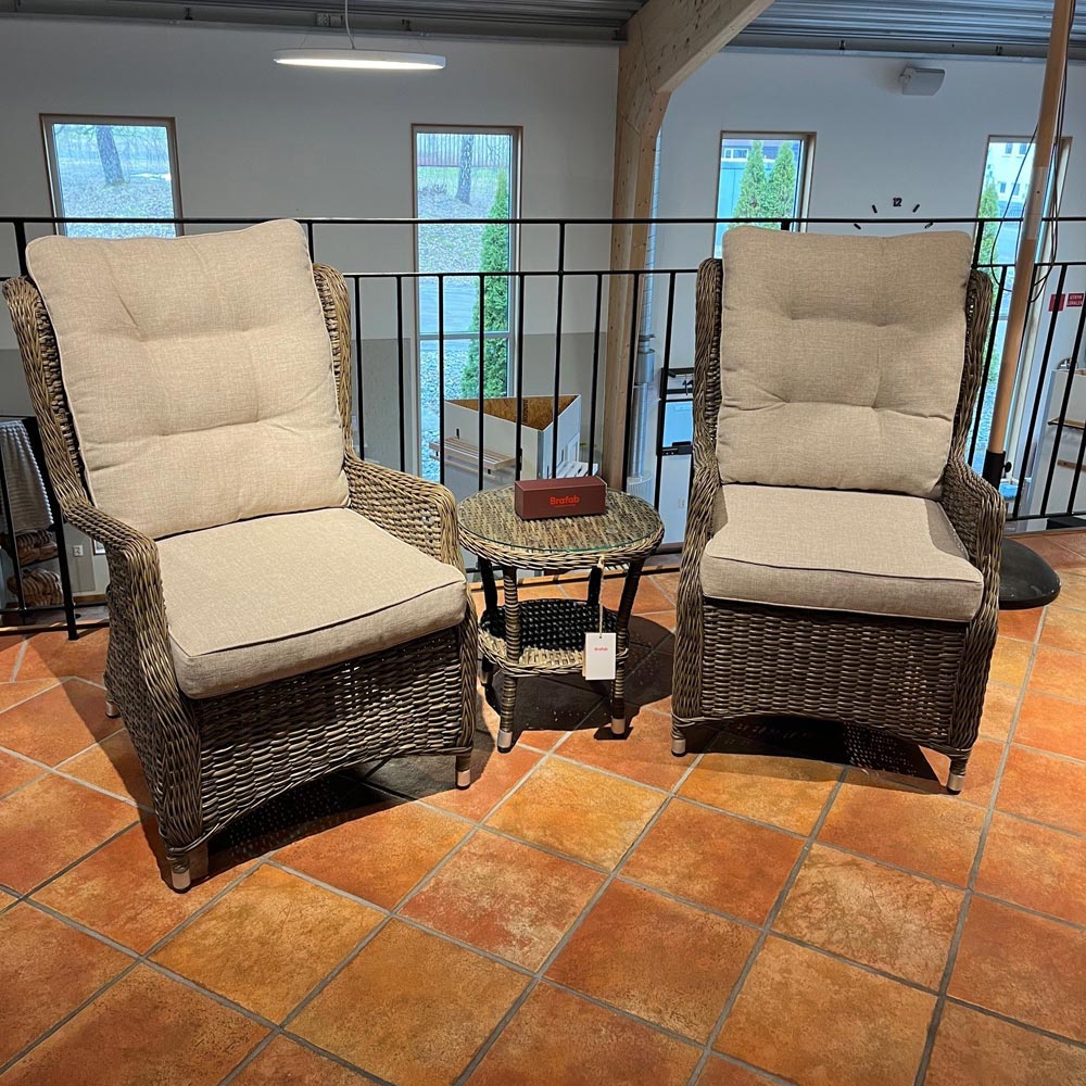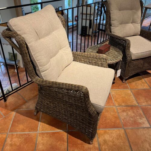 Vallmo fåtöljset från Brafab. Tillverkat i konstrotting med färgen brun/ rustik. Tjocka och bekväma dynor med olefintyg med beige färg. Glasskiva på sidobordet.