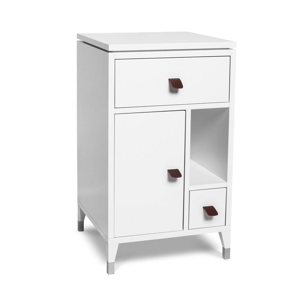 Abisko sängbord med låga ben från Mavis, designat av Sabina Grubbeson. Tillverkat i vitlack/ handtag i garvat älgskinn. Dörrar och lådor med mjukstängande gångjärn (softclose). Benen har en liten metallsko längst ner.
