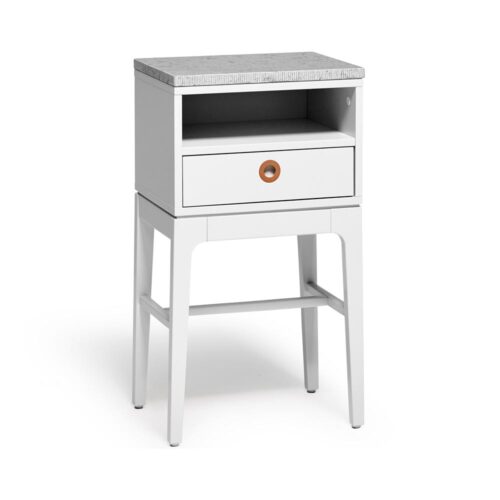 Höllviken sängbord i ljusgrå lack/ kalkstensskiva från Mavis, designat av Martina Elgemark. Handtag med snygg läderdetalj. Höllviken utstrålar en stram och skandinavisk design, men samtidigt varm och omtänksam.