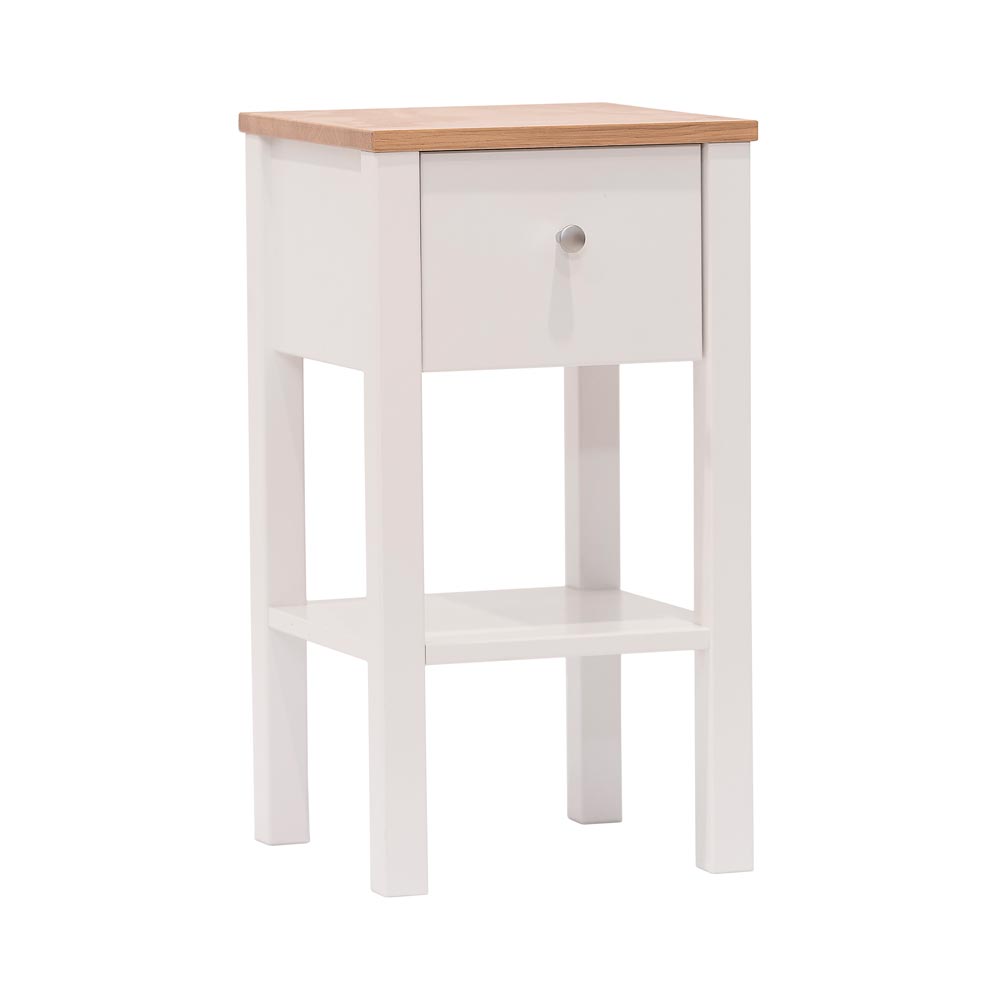 Saga sängbord i vitlack/ oljad ek. Stilren och tidlös svensk design. Saga sängbord levereras fabriksmonterat med en gedigen kvalité!