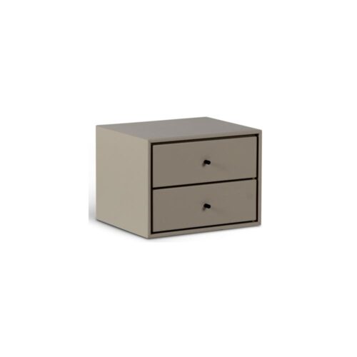 Volt vägghängt sängbord i beige lackad mdf och knoppar i svart från Mavis. Ett nätt, stilrent sängbord med lådor i plywood med underliggande mjukstängande skena, design av Martina Elgemark.
