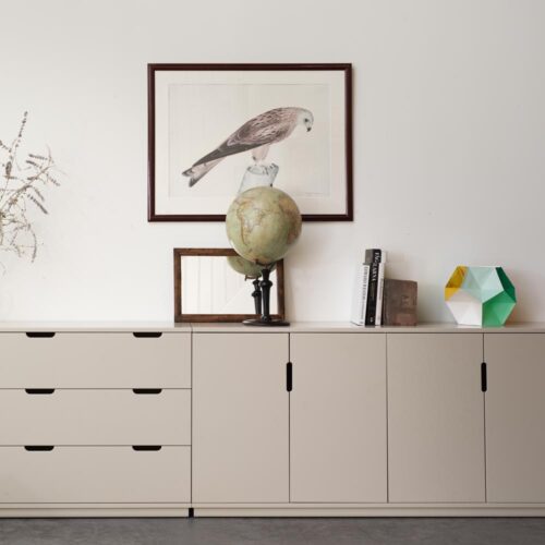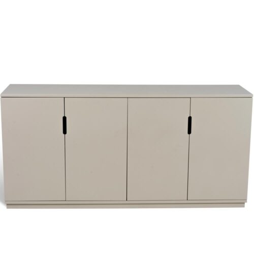 Aoko sideboard med täckta dörrar i beige lack från Mavis Möbler. Urfrästa handtag och mjukstängande gångjärn. Ett stilrent sideboard designat av Martina Elgemark.
