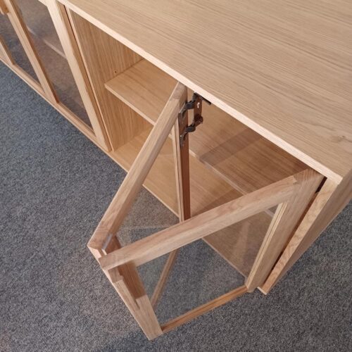 Casö 551 sideboard i massiv /fanerad oljad ek från danska Casö. Casö 551 sideboard är en snygg möbel i klassisk och tidlös design med rena linjer och mjukt rundade hörn. Sideboardet erbjuder bra förvaringsmöjligheter bakom vackra, mjukstängande vikdörrar i glas och med flyttbara hyllplan.