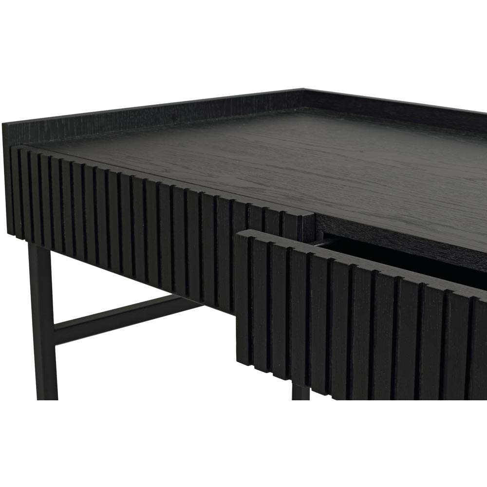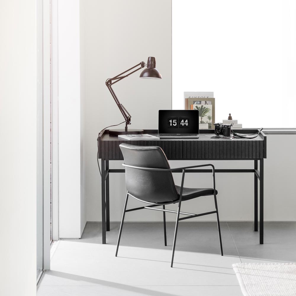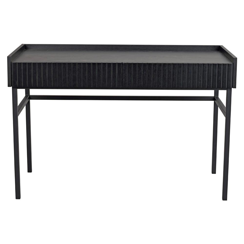 Halifax skrivbord i svartbetsad ek från Rowico. Ett stilrent skrivbord som funkar lika bra som sminkbord. Skrivbordet har en praktisk sarg runt bakre delen av bordsskivan som skapar avskildhet och skydd åt papper och annat.