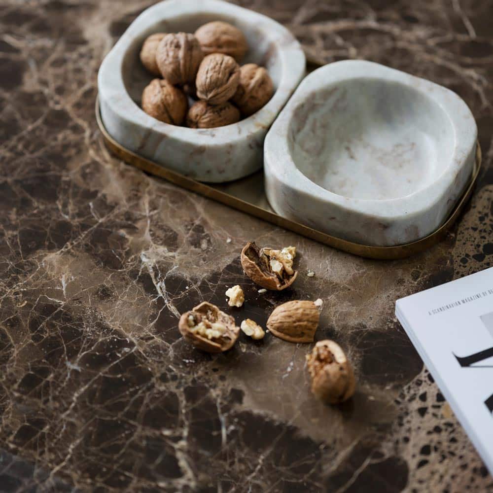 Hammond soffbord med bordskiva i brun äkta marmor och massivt underrede. Ett stilrent soffbord med lyxig känsla. Välj underrede i svarlack, brunolja eller vitpigmenterad ek.