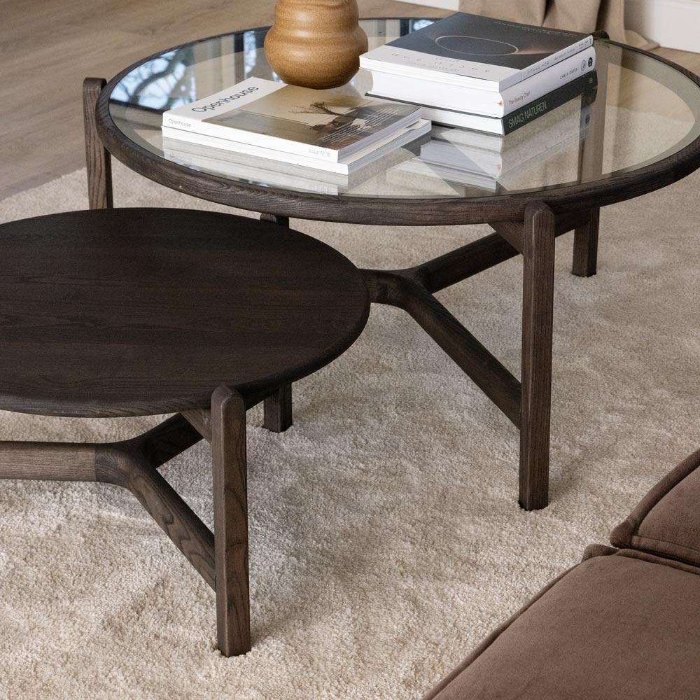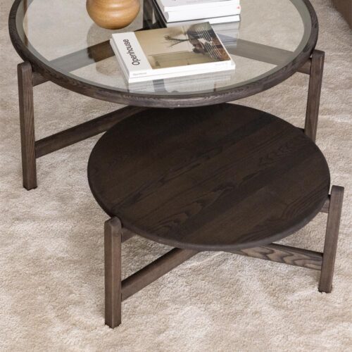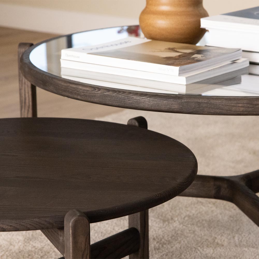 Optic runda soffbord i massiv oljad ask Mocca C15 i “Soft Round” design från danska Kristensen & Kristensen. Optic soffbord är designat av Cecilie Kamp.