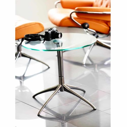 Stressless Urban soffbord S från norska Ekornes. Ett modern soffbord med skiva i klarglas/ underrede i krom.