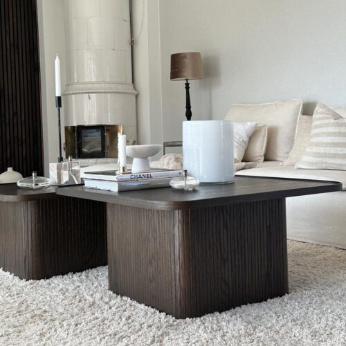 Foten har ett smakfullt mönster av stående frästa spår i massiv ek. Fanérad bordsskiva med rundande hörn som ger en mjuk känsla. Sullivan soffbord finns i två olika storlekar med olika höjder. Placera dem separat eller tillsammans som satsbord. Finns även i svart och vitpigmenterad ek.