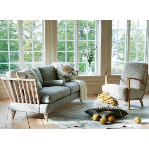 Särö soffa från småländska Bröderna Anderssons i en fantastiskt vacker design! Särö har en synlig massiv trästomme som håller samman ryggen och armstödens profiler. Ryggarna och sitsarna är stoppade med sjöfågelfjäder, vilket ger en härlig sittkomfort! Bilden visar Särö soffa 3-sits med stomme i vitpigmenterad ek.