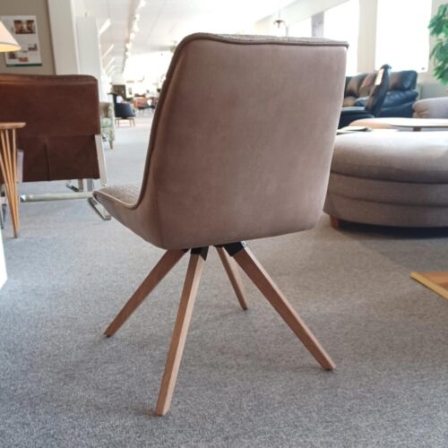 Hannover stol i mycket skön sittkomfort från danska hjort Knudsen. Hannover stol är klädd i tyg Chronotex clay och baksida i tyg Kentucky beige. Stolen har snurrunderrede i vitoljad ek.