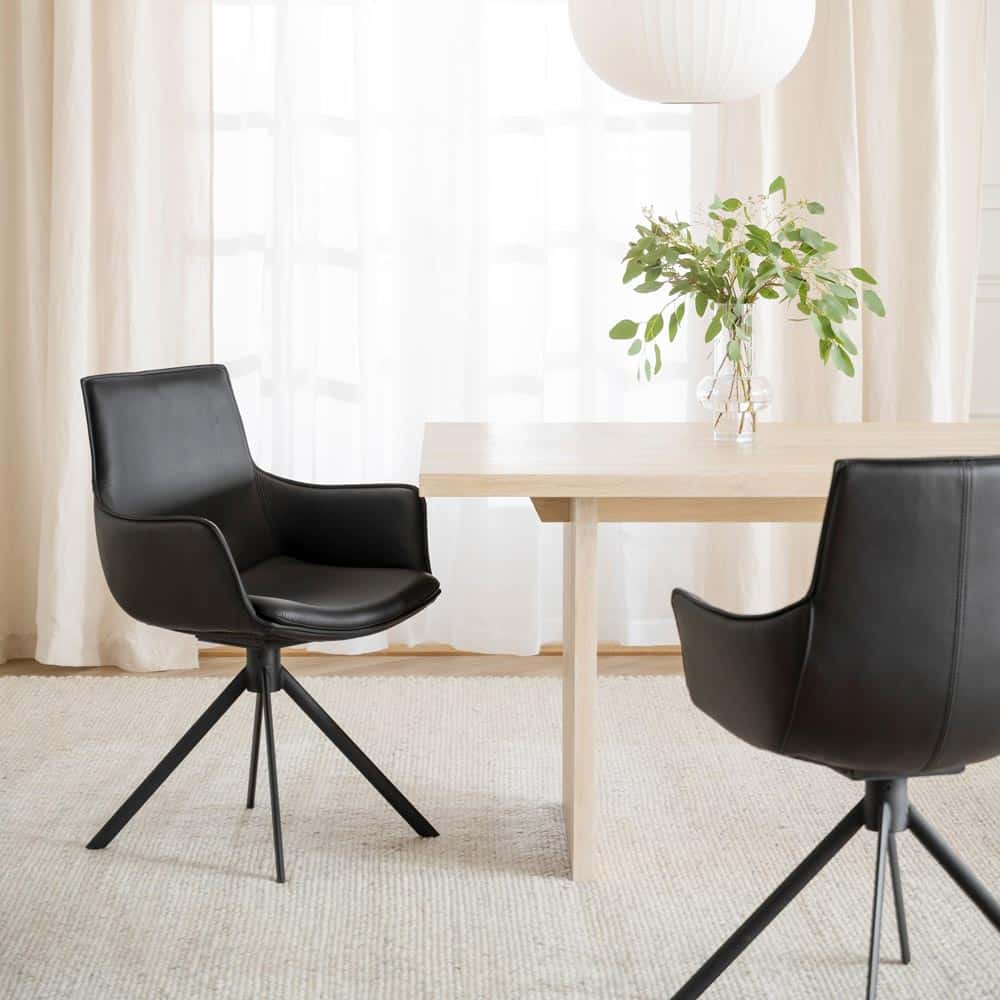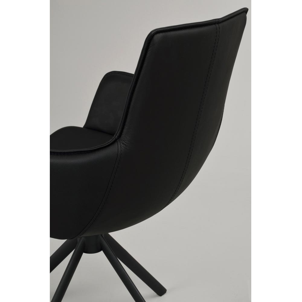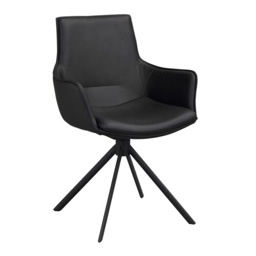 Lowell karmstol med snurrbart underrede i svart pulverlackad metall och sits i svart äkta skinn. En snygg karmstol med skön sittkomfort, i stilren design från Rowico.