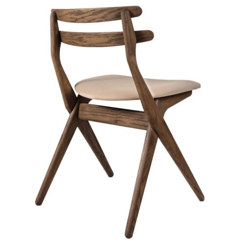 Namnet Saks betyder sax på danska och syftar på de korsade benen och deras formspråk. Saks är en bekväm stol med vackra detaljer och fint hantverk!