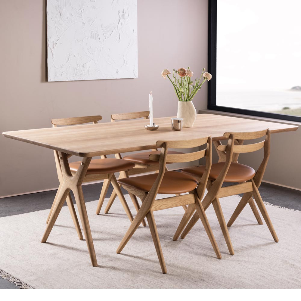Saks stol från Kristensen & Kristensen finns att beställa i ek eller ask. Välj mellan olika färger på ytbehandlingen samt vackra tyger och läder till sitsen!