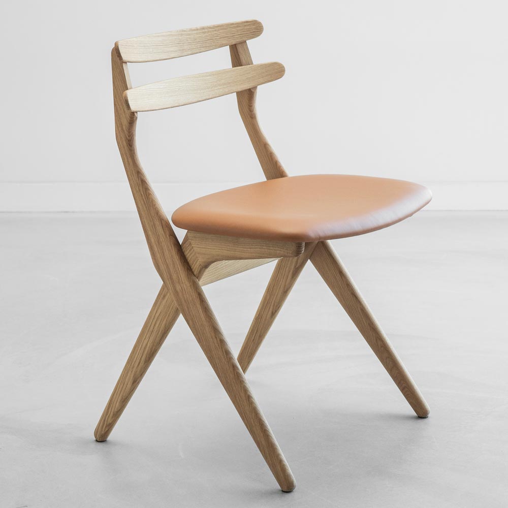 Namnet Saks betyder sax på danska och syftar på de korsade benen och deras formspråk. Saks är en bekväm stol med vackra detaljer och fint hantverk!