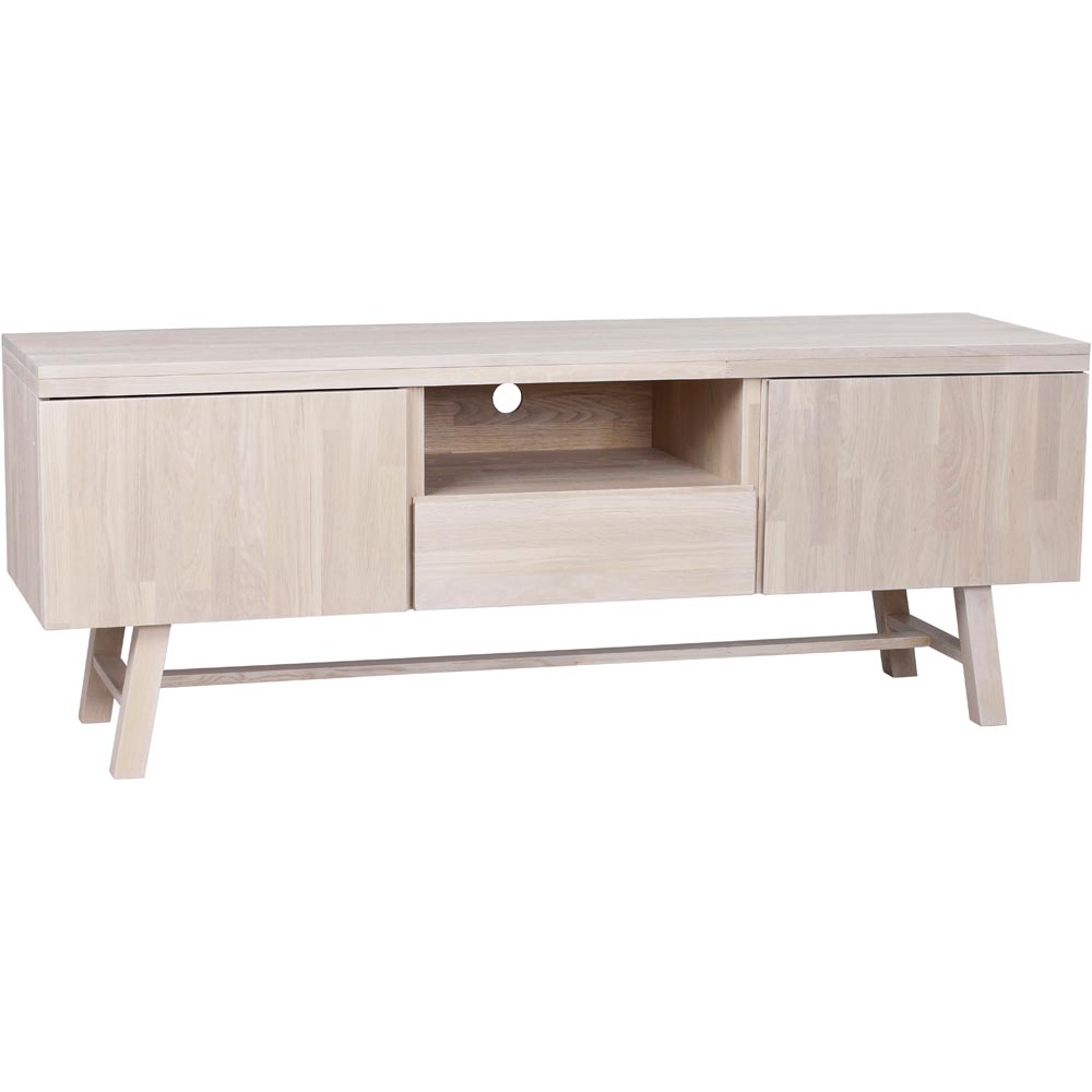 Brooklyn TV-bänk i whitewash ek olja från Rowico. En stilren TV-bänk med gott om förvaringsutrymme. Praktiskt hål för sladdar på baksidan och mjukstängande låda och luckor.