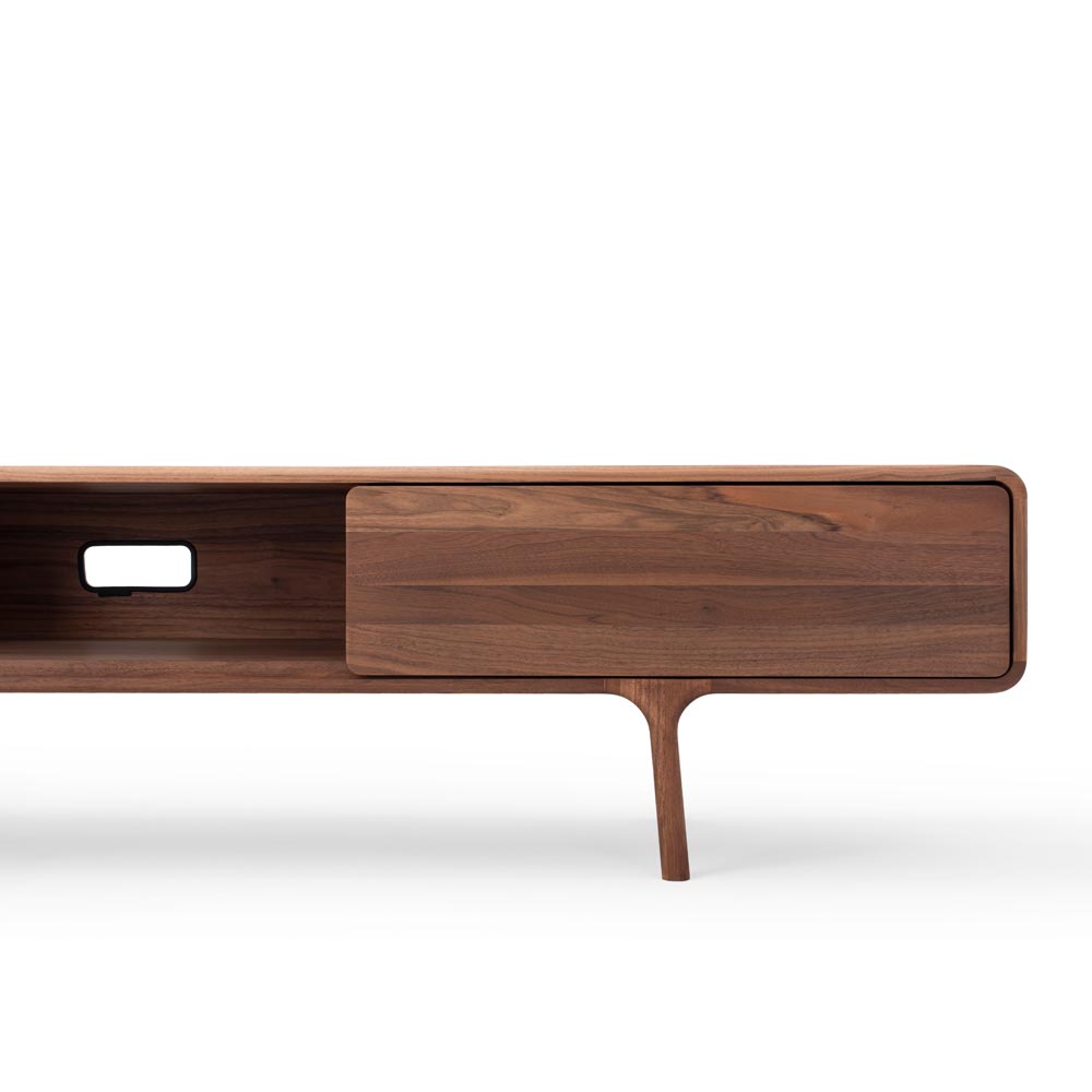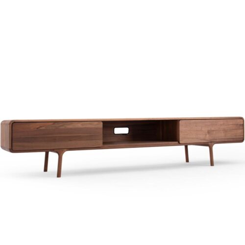 Fawn TV-bänk i massiv oljad valnöt med öppen mittdel från Gazzda. En mycket smäcker möbel med mjuka linjer och fint arbetade trädetaljer. Fawn TV-bänk ger en härlig kvalitétskänsla!