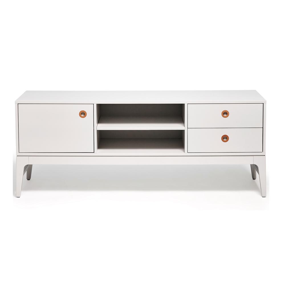 Höllviken TV-bänk i ljusgrå lack från Mavis, designad av Martina Elgemark. Handtag med snygga läderdetaljer. Höllviken utstrålar en stram och skandinavisk design, men samtidigt varm och omtänksam.