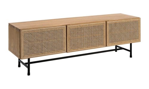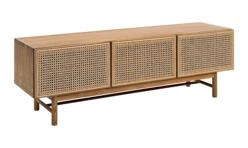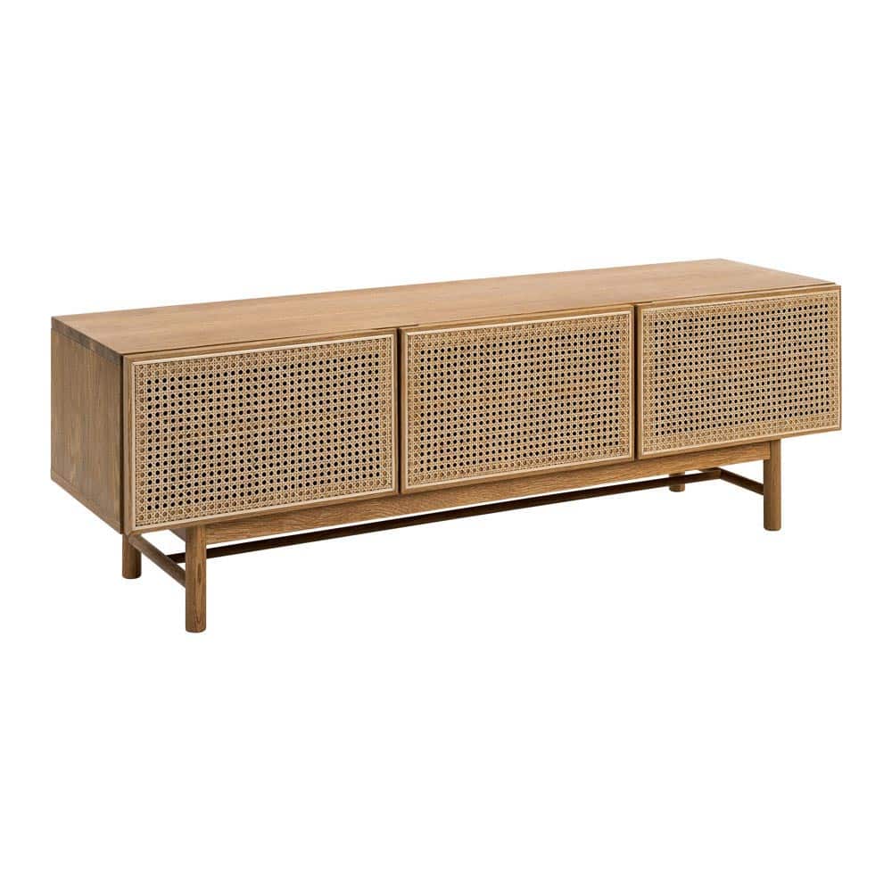 Racquet TV-bänk från Hans K med stomme i oljad ek och luckor i rotting. Design av Jannis Ellenberger. En snygg, stilren mediabänk med bra förvaringsmöjligheter.