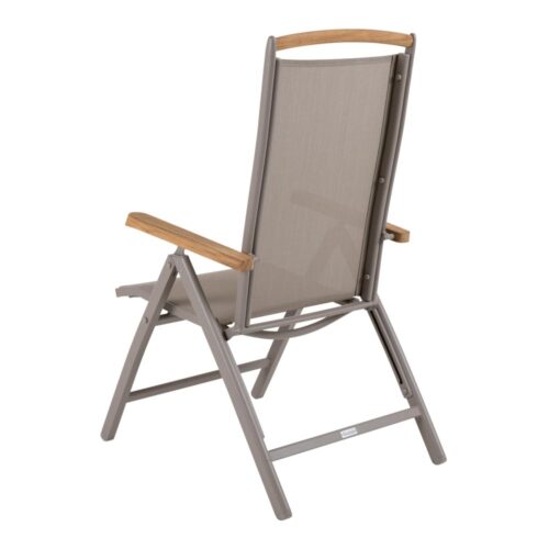 Andy positionsstol i pulverlackad aluminium och sits och rygg i textilene, armstöd i teak från Brafab. Fördelen med en positionsstol är att du enkelt kan luta dig tillbaka och njuta.
