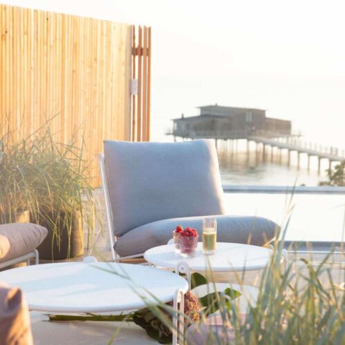 Blixt runt soffbord 65cm i vit aluminium från Brafab. Bordsskivan är perforerad vilket är en snygg detalj men också praktiskt då vattnet rinner igenom.