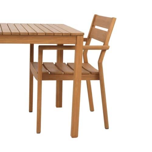 Delia karmstol tillsammans med Joe matbord i massiv teak från Brafab. Bordet finns i två olika storlekar och den sköna Delia stolen är också praktisk då den går att stapla.
