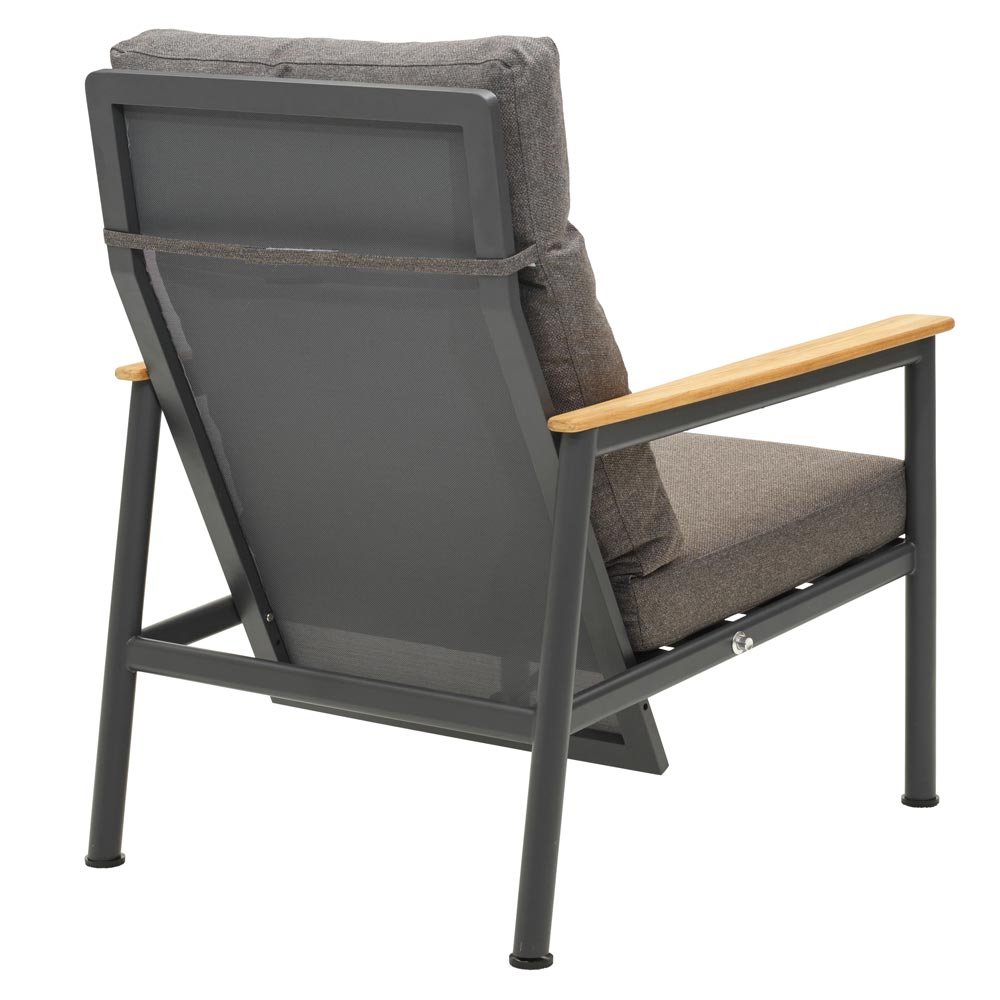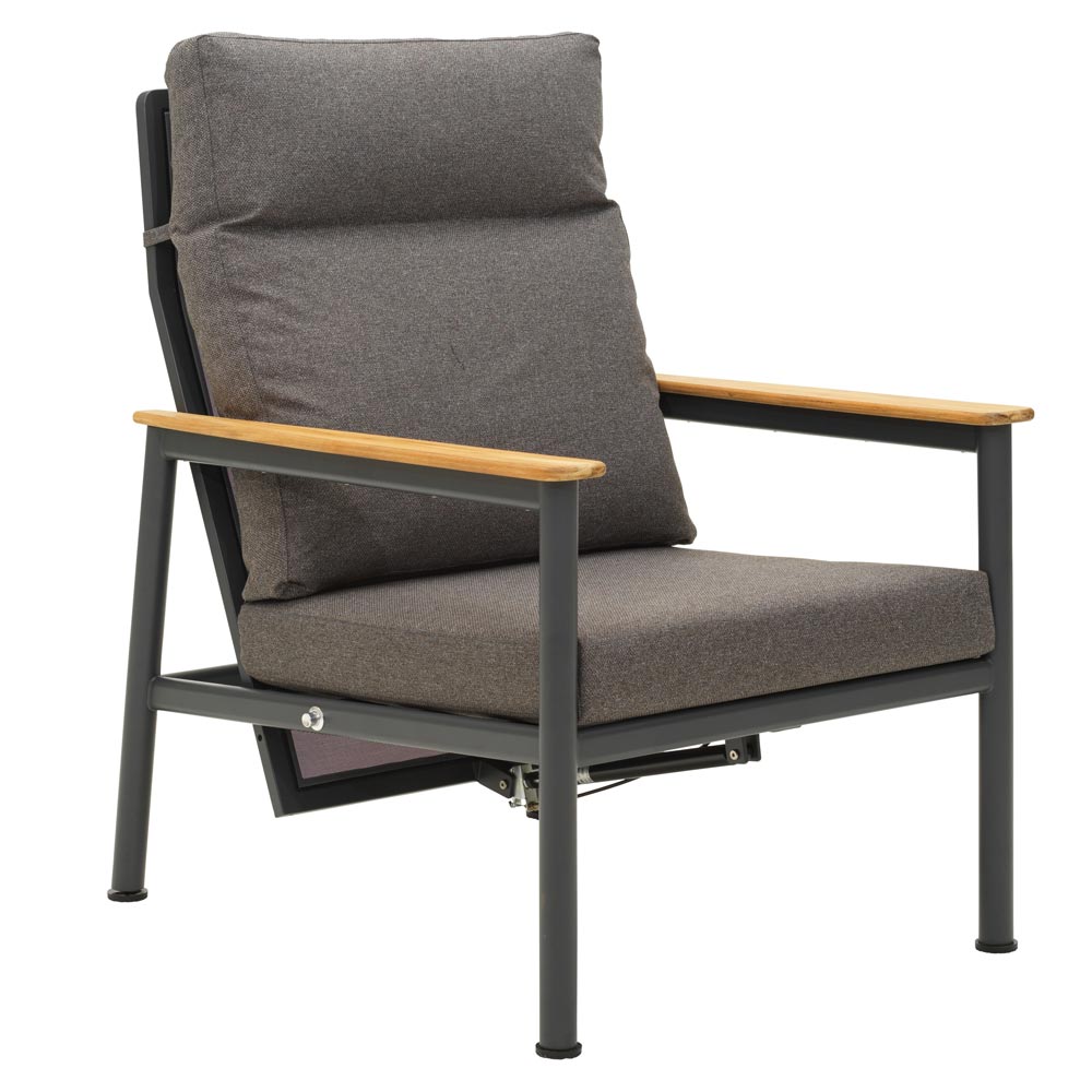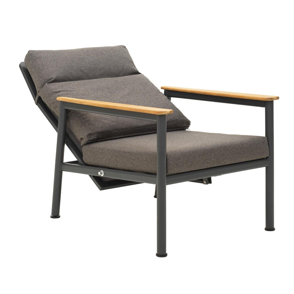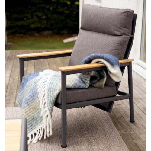 Gordon fåtölj med vattenavvisande TPU-liner från Brafab, Gordon kombinerar komfort och rena linjer i en tidlös design. Pulverlackad aluminium och armstöd i teak ger fåtöljen en bra hållbarhet och ett modernt uttryck. Med ett enkelt knapptryck kan ryggen steglöst regleras bakåt, och du bestämmer själv om du vill sitta upp eller luta dig tillbaka i en mer avslappnad position.