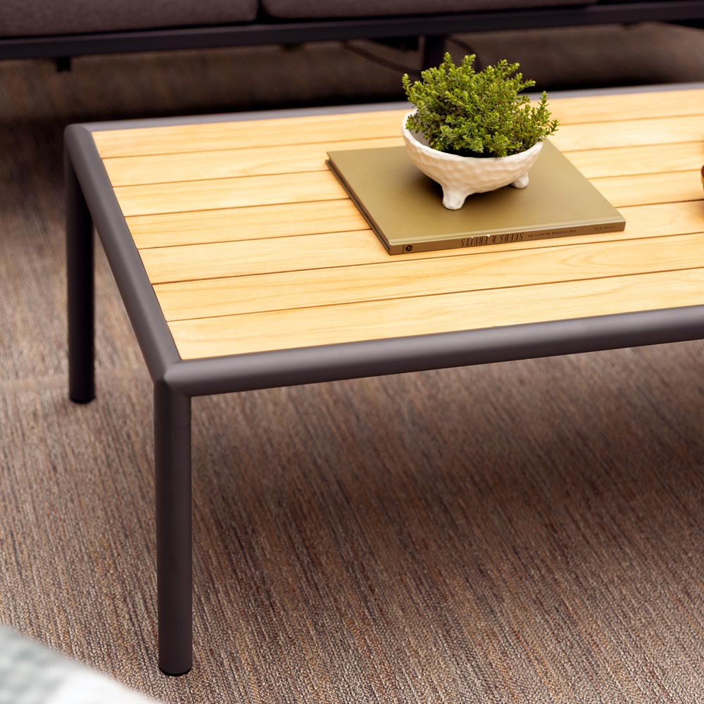 Gordon soffbord i pulverlackad aluminium och massiv teak från Brafab. Snyggt soffbord som passar till soffa och fåtöljer i samma serie.