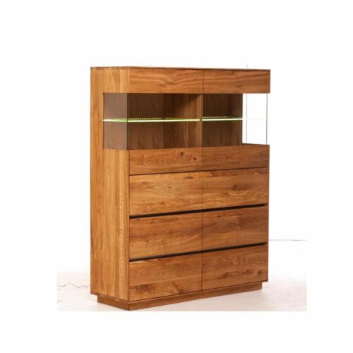 Fargo highboard i massiv oljad vildek/ rostfritt stål från LIB. En gedigen möbel med rustik känsla. Välj med eller utan LED-belysning!