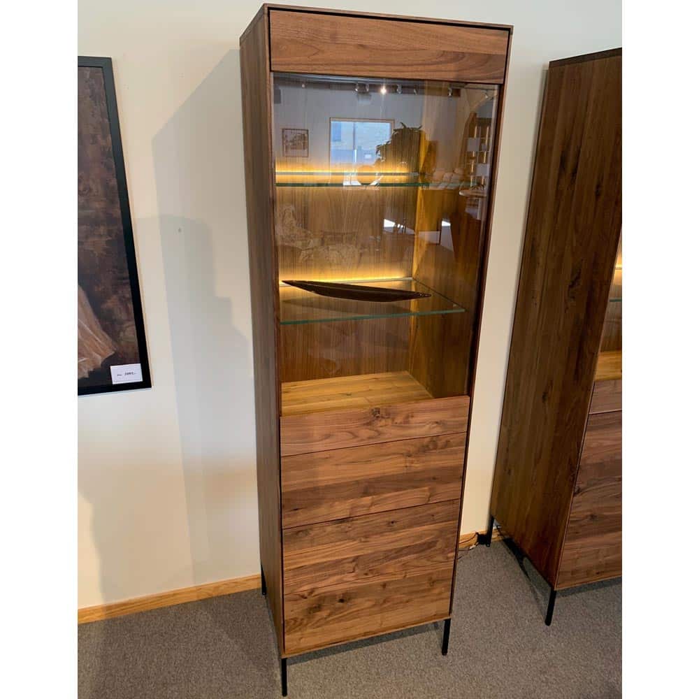 Helga vitrinskåp i massiv oljad valnöt/ metallben inkl. LED-belysning från LIB. 1st glasdörr med två glashyllor + 3st lådor.