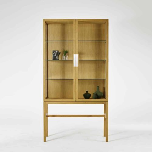 Övide vitrinskåp i oljad ek från gotländska G.A.D. Den avskalade designen med glassidor ger ett luftigt och modernt intryck med bästa exponering av dina käraste ägodelar! Dörrarna öppnas med Push-öppning med beslag i läder eller rostfritt stål.