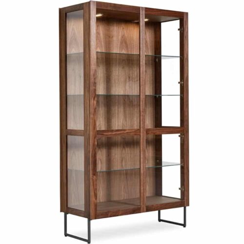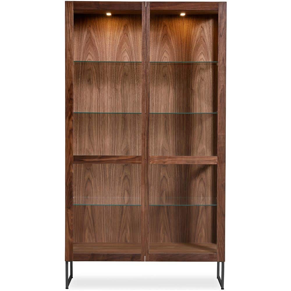 SM452 vitrinskåp i massiv oljad valnöt från danska Skovby. Ett stilrent vitrinskåp med bra ljusinsläpp tack vare glassidorna. Inkl. LED-belysning. Metallunderrede.