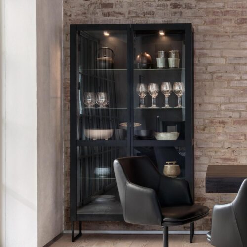 SM452 vitrinskåp i svartbetsad ek från danska Skovby. Ett stilrent vitrinskåp med bra ljusinsläpp tack vare glassidorna. Inkl. LED-belysning. Svart metallunderrede.