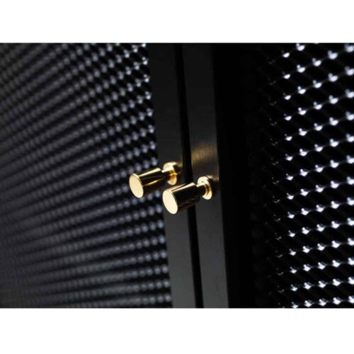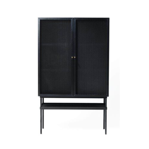 Streck barskåp i svartbetsad ekfanér/ metall från Homeline. Streck skåp har dörrar och hyllan i metallnät vilket ger en glimt av vad som döljer sig bakom. En läcker detalj med knoppar, fötter + pianogångjärn i mässing!